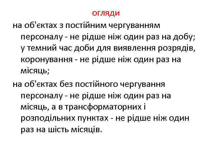огляди на об'єктах з постійним чергуванням персоналу - не рідше ніж один раз на добу; у темний час доби для виявлення розрядів, коронування - не рідше ніж один раз на місяць; на об'єктах без постійного чергування персоналу - не рідше ніж один раз на місяць, а в трансформаторних і розподільних пунктах - не рідше ніж один раз на шість місяців.