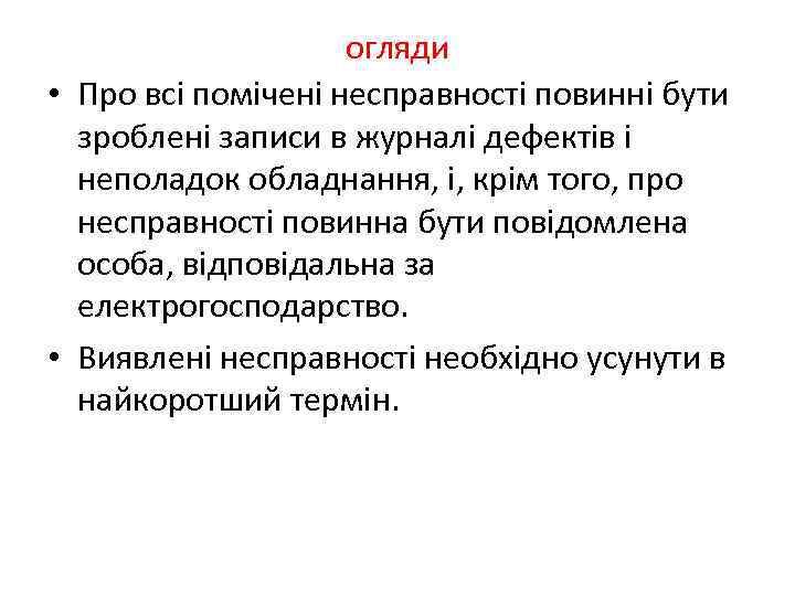 огляди • Про всі помічені несправності повинні бути зроблені записи в журналі дефектів і неполадок обладнання, і, крім того, про несправності повинна бути повідомлена особа, відповідальна за електрогосподарство. • Виявлені несправності необхідно усунути в найкоротший термін.