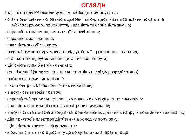 огляди Під час огляду РУ особливу увагу необхідно звернути на: - стан приміщення - справність дверей і вікон, відсутність протікання покрівлі та міжповерхового перекриття, наявність та справність замків; - справність опалення, вентиляції та освітлення; - справність заземлення; - наявність засобів захисту; - рівень і температуру масла та відсутність її протікання в апаратах; - стан контактів, рубильників щита низької напруги; - цілісність пломб на лічильниках; - стан ізоляції (запиленість, наявність тріщин, слідів розрядів тощо); - роботу системи сигналізації; - тиск повітря в баках повітряних вимикачів; - відсутність витоків повітря; - справність і правильність показів покажчиків положення вимикачів; - наявність вентиляції полюсів повітряних вимикачів; - відсутність течі масла з конденсаторів ємнісних дільників напруги повітряних вимикачів; - дію пристроїв електропідігрівання в холодну пору року; - щільність закриття шаф керування; - можливість вільного доступу до комутаційних апаратів тощо