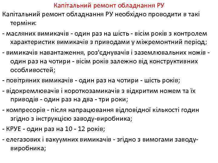 Капітальний ремонт обладнання РУ необхідно проводити в такі терміни: - масляних вимикачів - один раз на шість - вісім років з контролем характеристик вимикачів з приводами у міжремонтний період; - вимикачів навантаження, роз'єднувачів і заземлювальних ножів - один раз на чотири - вісім років залежно від конструктивних особливостей; - повітряних вимикачів - один раз на чотири - шість років; - відокремлювачів і короткозамикачів з відкритим ножем та їх приводів - один раз на два - три роки; - компресорів - після напрацювання відповідної кількості годин згідно з інструкцією заводу-виробника; - КРУЕ - один раз на 10 - 12 років; - елегазових і вакуумних вимикачів - згідно з вимогами заводу- виробника;