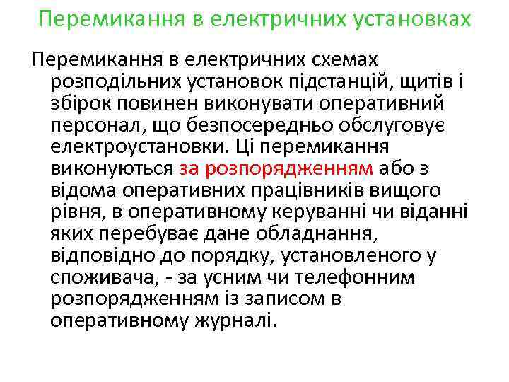 Перемикання в електричних установках Перемикання в електричних схемах розподільних установок підстанцій, щитів і збірок повинен виконувати оперативний персонал, що безпосередньо обслуговує електроустановки. Ці перемикання виконуються за розпорядженням або з відома оперативних працівників вищого рівня, в оперативному керуванні чи віданні яких перебуває дане обладнання, відповідно до порядку, установленого у споживача, - за усним чи телефонним розпорядженням із записом в оперативному журналі.