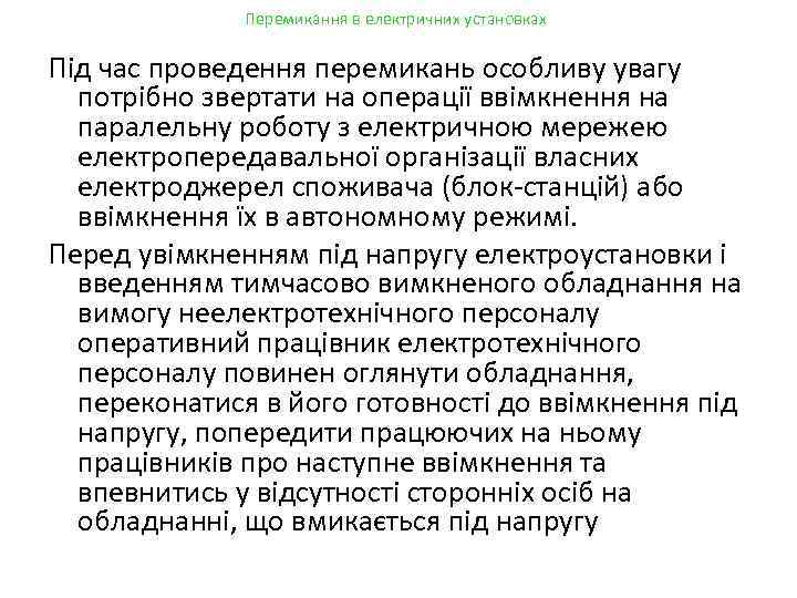 Перемикання в електричних установках Під час проведення перемикань особливу увагу потрібно звертати на операції ввімкнення на паралельну роботу з електричною мережею електропередавальної організації власних електроджерел споживача (блок-станцій) або ввімкнення їх в автономному режимі. Перед увімкненням під напругу електроустановки і введенням тимчасово вимкненого обладнання на вимогу неелектротехнічного персоналу оперативний працівник електротехнічного персоналу повинен оглянути обладнання, переконатися в його готовності до ввімкнення під напругу, попередити працюючих на ньому працівників про наступне ввімкнення та впевнитись у відсутності сторонніх осіб на обладнанні, що вмикається під напругу