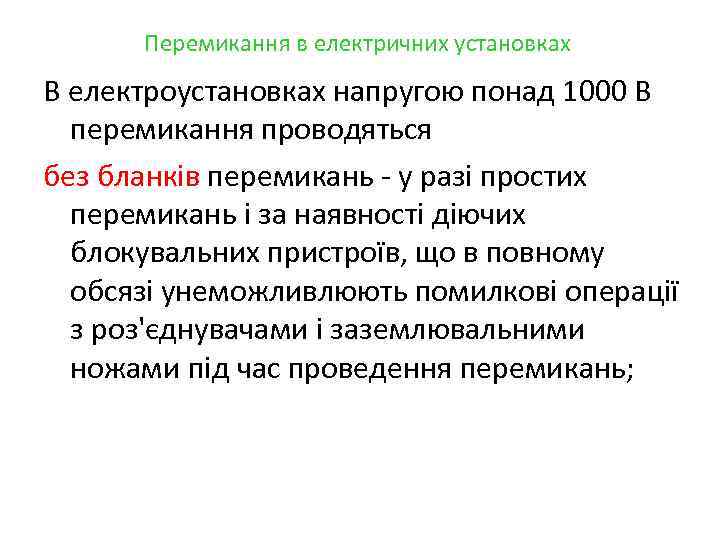 Перемикання в електричних установках В електроустановках напругою понад 1000 В перемикання проводяться без бланків перемикань - у разі простих перемикань і за наявності діючих блокувальних пристроїв, що в повному обсязі унеможливлюють помилкові операції з роз'єднувачами і заземлювальними ножами під час проведення перемикань;