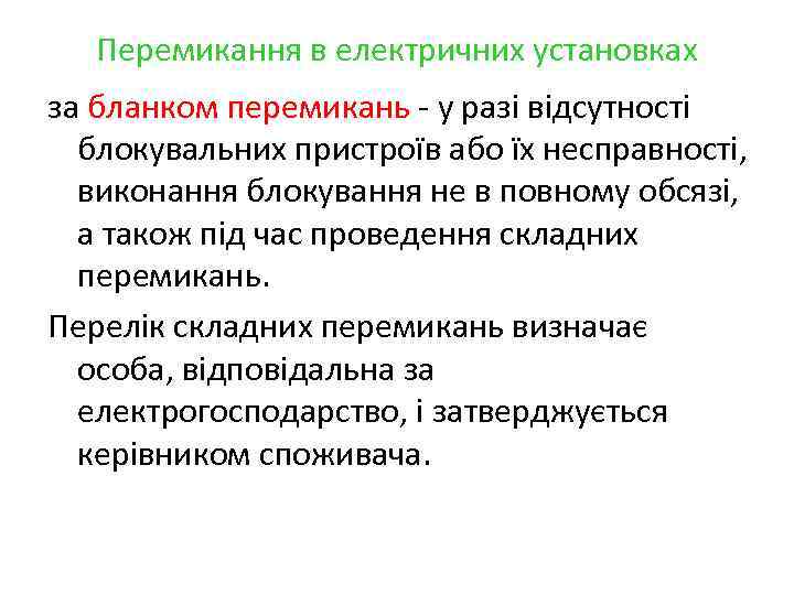 Перемикання в електричних установках за бланком перемикань - у разі відсутності блокувальних пристроїв або їх несправності, виконання блокування не в повному обсязі, а також під час проведення складних перемикань. Перелік складних перемикань визначає особа, відповідальна за електрогосподарство, і затверджується керівником споживача.
