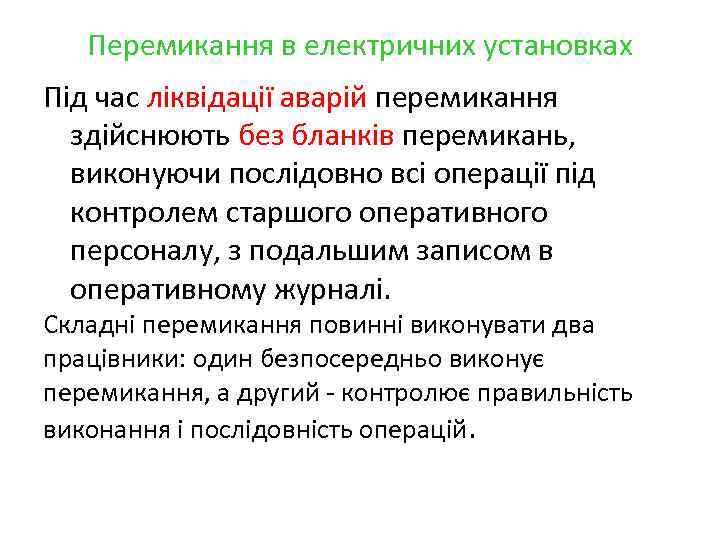 Перемикання в електричних установках Під час ліквідації аварій перемикання здійснюють без бланків перемикань, виконуючи послідовно всі операції під контролем старшого оперативного персоналу, з подальшим записом в оперативному журналі. Складні перемикання повинні виконувати два працівники: один безпосередньо виконує перемикання, а другий - контролює правильність виконання і послідовність операцій.