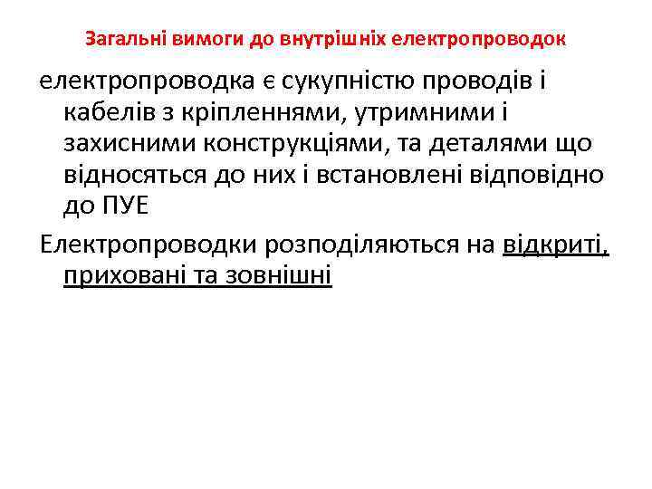 Загальнi вимоги до внутрiшнiх електропроводок електропроводка є сукупнiстю проводiв i кабелiв з крiпленнями, утримними i захисними конструкцiями, та деталями що вiдносяться до них i встановленi вiдповiдно до ПУЕ Електропроводки розподiляються на вiдкриті, приховані та зовнiшні
