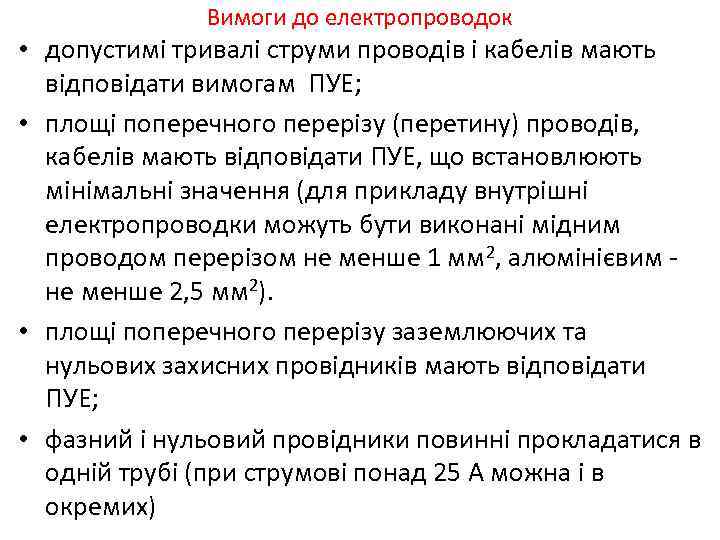Вимоги до електропроводок • допустимi тривалi струми проводiв i кабелiв мають вiдповiдати вимогам ПУЕ; • площі поперечного перерiзу (перетину) проводiв, кабелiв мають вiдповiдати ПУЕ, що встановлюють мiнiмальні значення (для прикладу внутрiшнi електропроводки можуть бути виконанi мiдним проводом перерiзом не менше 1 мм 2, алюмiнiєвим - не менше 2, 5 мм 2). • площі поперечного перерiзу заземлюючих та нульових захисних провiдникiв мають вiдповiдати ПУЕ; • фазний i нульовий провiдники повинні прокладатися в однiй трубi (при струмовi понад 25 А можна i в окремих)