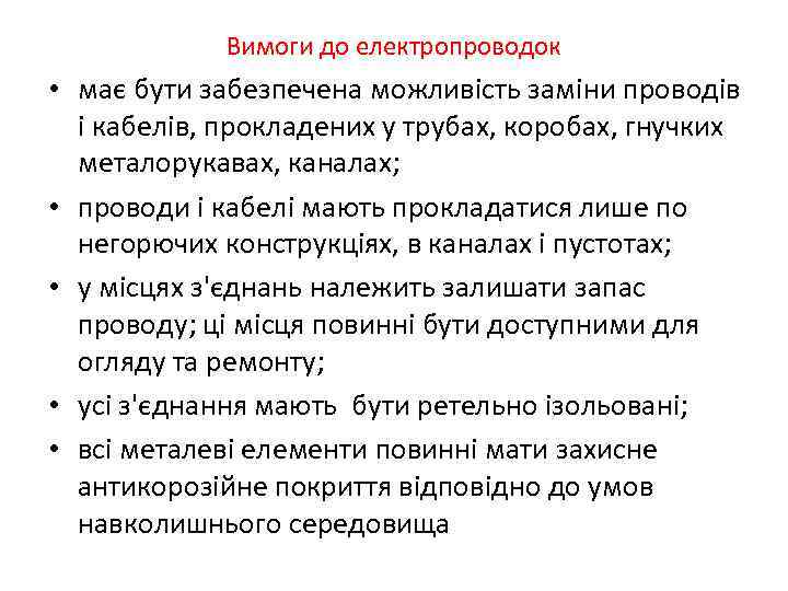 Вимоги до електропроводок • має бути забезпечена можливiсть замiни проводiв i кабелiв, прокладених у трубах, коробах, гнучких металорукавах, каналах; • проводи i кабелi мають прокладатися лише по негорючих конструкцiях, в каналах i пустотах; • у мiсцях з'єднань належить залишати запас проводу; цi мiсця повинні бути доступними для огляду та ремонту; • усi з'єднання мають бути ретельно iзольованi; • всi металевi елементи повиннi мати захисне антикорозiйне покриття вiдповiдно до умов навколишнього середовища
