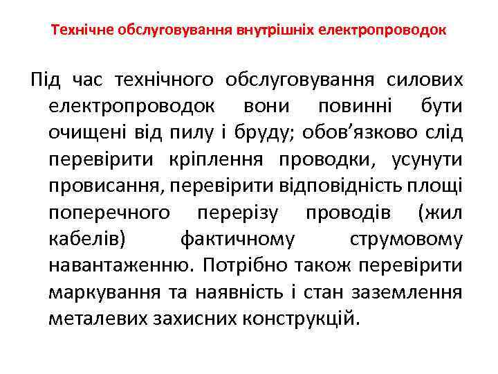 Технічне обслуговування внутрiшнiх електропроводок Під час технiчного обслуговування силових електропроводок вони повиннi бути очищенi вiд пилу i бруду; обов’язково слiд перевiрити крiплення проводки, усунути провисання, перевiрити вiдповiднiсть площi поперечного перерiзу проводiв (жил кабелiв) фактичному струмовому навантаженню. Потрiбно також перевiрити маркування та наявнiсть i стан заземлення металевих захисних конструкцiй.
