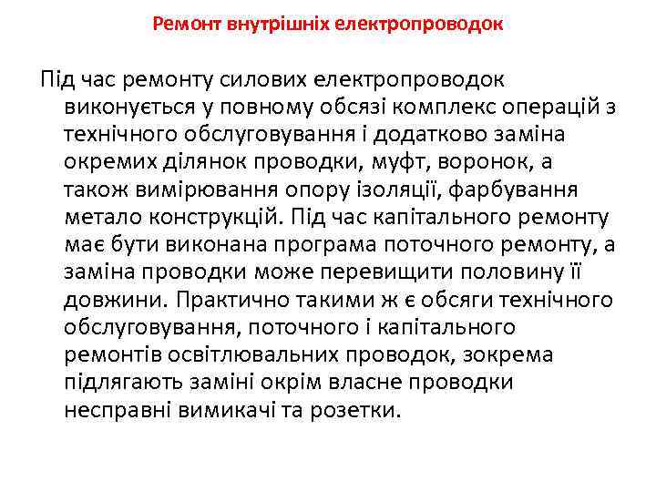 Ремонт внутрiшнiх електропроводок Під час ремонту силових електропроводок виконується у повному обсязi комплекс операцiй з технiчного обслуговування i додатково замiна окремих дiлянок проводки, муфт, воронок, а також вимiрювання опору iзоляцiї, фарбування метало конструкцiй. Під час капітального ремонту має бути виконана програма поточного ремонту, а заміна проводки може перевищити половину її довжини. Практично такими ж є обсяги технiчного обслуговування, поточного i капiтального ремонтiв освiтлювальних проводок, зокрема пiдлягають замiнi окрiм власне проводки несправнi вимикачi та розетки.
