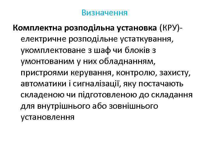 Визначення Комплектна розподільна установка (КРУ)- електричне розподільне устаткування, укомплектоване з шаф чи блоків з умонтованим у них обладнанням, пристроями керування, контролю, захисту, автоматики і сигналізації, яку постачають складеною чи підготовленою до складання для внутрішнього або зовнішнього установлення