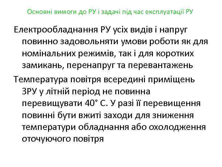 Основні вимоги до РУ і задачі під час експлуатації РУ Електрообладнання РУ усіх видів і напруг повинно задовольняти умови роботи як для номінальних режимів, так і для коротких замикань, перенапруг та перевантажень Температура повітря всередині приміщень ЗРУ у літній період не повинна перевищувати 40° C. У разі її перевищення повинні бути вжиті заходи для зниження температури обладнання або охолодження оточуючого повітря