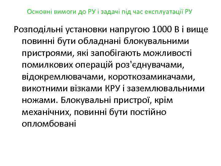 Основні вимоги до РУ і задачі під час експлуатації РУ Розподільні установки напругою 1000 В і вище повинні бути обладнані блокувальними пристроями, які запобігають можливості помилкових операцій роз'єднувачами, відокремлювачами, короткозамикачами, викотними візками КРУ і заземлювальними ножами. Блокувальні пристрої, крім механічних, повинні бути постійно опломбовані