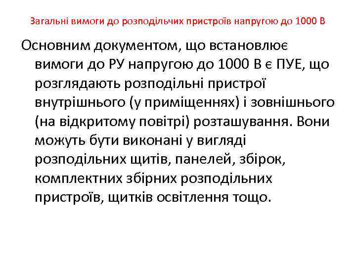 Загальні вимоги до розподільчих пристроїв напругою до 1000 В Основним документом, що встановлює вимоги до РУ напругою до 1000 В є ПУЕ, що розглядають розподiльнi пристрої внутрiшнього (у примiщеннях) i зовнiшнього (на вiдкритому повiтрi) розташування. Вони можуть бути виконанi у виглядi розподiльних щитiв, панелей, збiрок, комплектних збiрних розподiльних пристроїв, щиткiв освiтлення тощо.