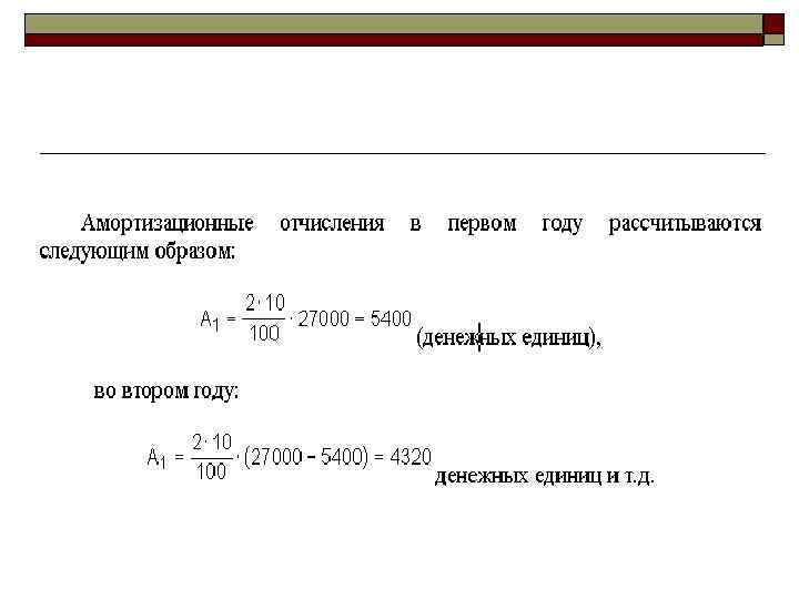 Двойной остаточный метод В этом случае сначала применяют прямолинейный метод. Стоимость основных производственных средств делится на количество периодов, таким образом, определяется размер ежегодных амортизационных отчислений. Затем подсчитывается процент амортизаций за период путем деления размера ежегодных амортизационных отчислений на стоимость основных производственных средств (первоначальная стоимость за вычетом ликвидационной стоимости) и умножается на 100 процентов. А = (2 · r) · (S – Анак. ), o где r — ставка прямолинейного метода; o S — первоначальная стоимость основных производственных средств; o. Анак. — накопленная амортизация