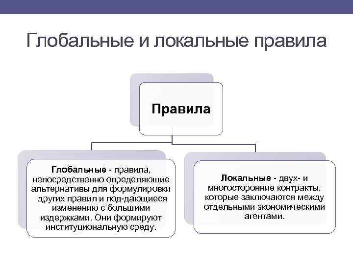 Глобальные и локальные правила Правила Глобальные правила, непосредственно определяющие альтернативы для формулировки других правил и под дающиеся изменению с большими издержками. Они формируют институциональную среду. Локальные двух и многосторонние контракты, которые заключаются между отдельными экономическими агентами.