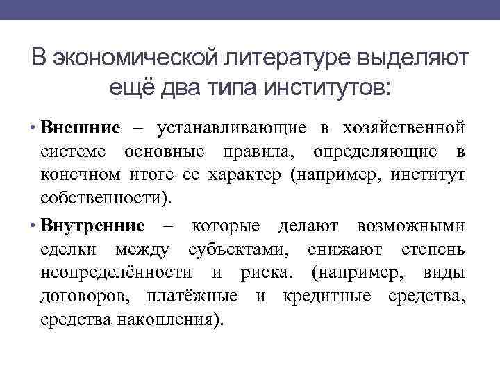 В экономической литературе выделяют ещё два типа институтов: • Внешние – устанавливающие в хозяйственной системе основные правила, определяющие в конечном итоге ее характер (например, институт собственности). • Внутренние – которые делают возможными сделки между субъектами, снижают степень неопределённости и риска. (например, виды договоров, платёжные и кредитные средства, средства накопления).