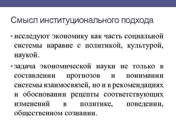 Смысл институционального подхода • исследуют экономику как часть социальной системы наравне с политикой, культурой, наукой. • задача экономической науки не только в составлении прогнозов и понимании системы взаимосвязей, но и в рекомендациях и обосновании рецепты соответствующих изменений в политике, поведении, общественном сознании.
