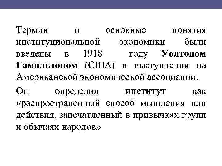 Термин и основные понятия институциональной экономики были введены в 1918 году Уолтоном Гамильтоном (США) в выступлении на Американской экономической ассоциации. Он определил институт как «распространенный способ мышления или действия, запечатленный в привычках групп и обычаях народов»