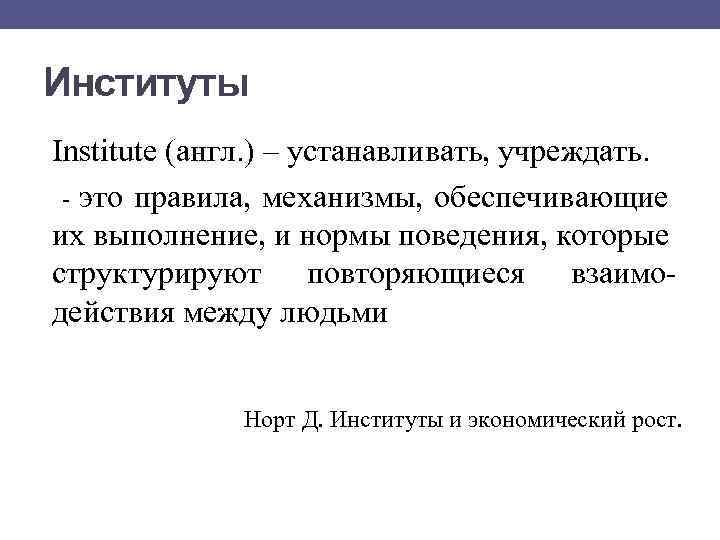 Институты Institute (англ. ) – устанавливать, учреждать. это правила, механизмы, обеспечивающие их выполнение, и нормы поведения, которые структурируют повторяющиеся взаимодействия между людьми Норт Д. Институты и экономический рост.