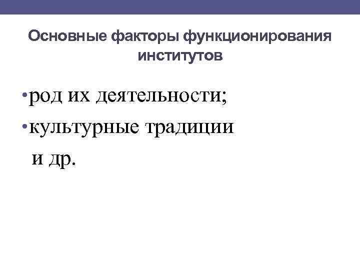 Основные факторы функционирования институтов • род их деятельности; • культурные традиции и др.