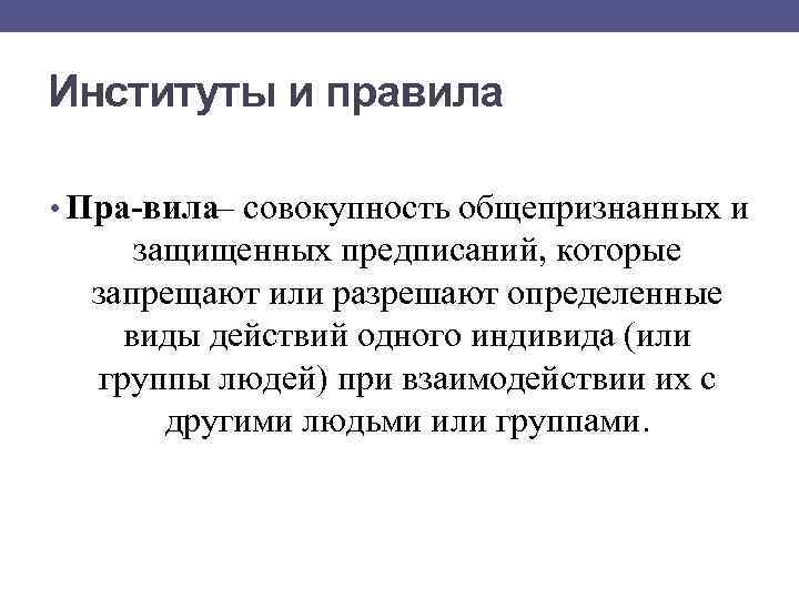 Институты и правила • Пра вила– совокупность общепризнанных и защищенных предписаний, которые запрещают или разрешают определенные виды действий одного индивида (или группы людей) при взаимодействии их с другими людьми или группами.