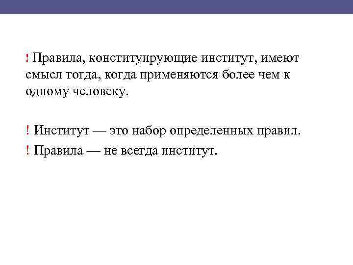! Правила, конституирующие институт, имеют смысл тогда, когда применяются более чем к одному человеку. ! Институт — это набор определенных правил. ! Правила — не всегда институт.