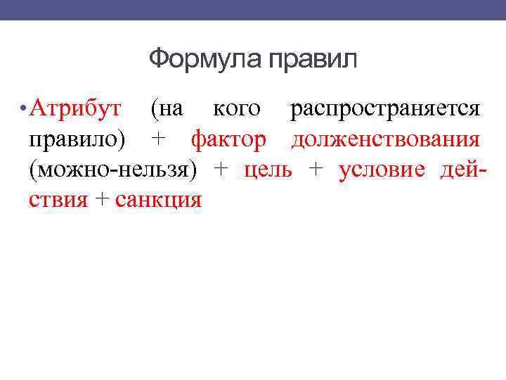 Формула правил • Атрибут (на кого распространяется правило) + фактор долженствования (можно-нельзя) + цель + условие действия + санкция