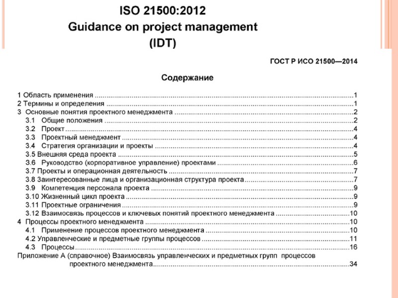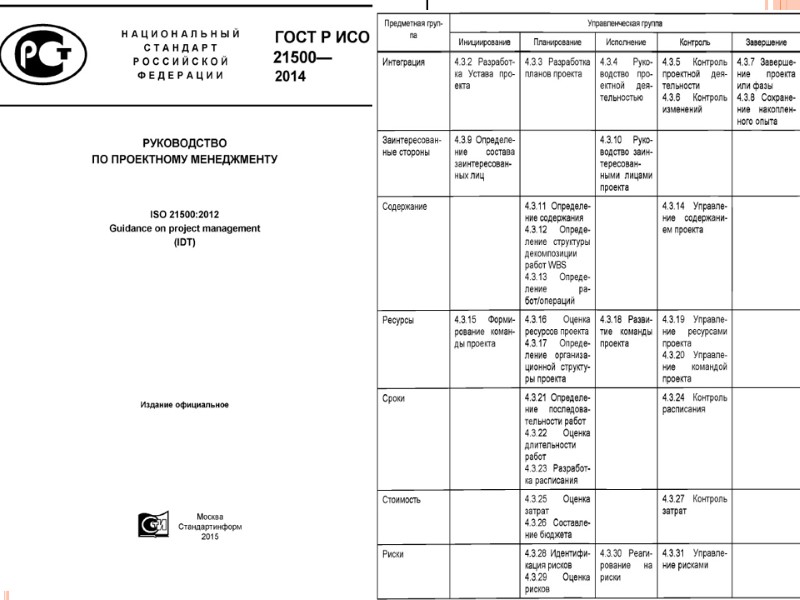СТАНДАРТЫ ПО УПРАВЛЕНИЮ ПРОЕКТАМИ 1. ISO 21500:2012 Guidance on project management «Руководство по проектному менеджменту». 2. International Competence Baseline (ICB IPMA) Version 3.0, 2006. IPMA Швейцария. 3. Основы Профессиональных Знаний и Национальные Требования к Компетентности Специалистов по Управлению Проектами (НТК 3.0). СОВНЕТ. 2010 – Россия. 4.ГОСТ Р 54869—2011 «Проектный менеджмент. Требования к управлению проектом» - Россия. 5.ГОСТ Р 54870—2011 «Проектный менеджмент. Требования к управлению портфелем проектов» - Россия. 6.ГОСТ Р 54871—2011 «Проектный менеджмент. Требования к управлению программой» - Россия. 7.APM Body of Knowledge - Великобритания. 8.DIN 69901 – Германия. 9.A Guide to the Project Management Body of Knowledge (PMBOK) - PMI США. Руководство к своду знаний по управлению проектами. Пятое издание. PMI. 2013. 10. The Standard for Program Management, Second Edition, PMI 2008. 11. The Standard for Portfolio Management, Second Edition, PMI 2008. 12. OPM3 Organizational Project Management Maturity Model, PMI, 2008. 13. PRINCE2 (PRojects IN a Controlled Environment) – Великобритания. 14. A Guidebook of Project and Program Management for Enterprise Innovation (P2M). Руководство по управлению инновационными проектами и программами предприятий. PMAJ. Япония.