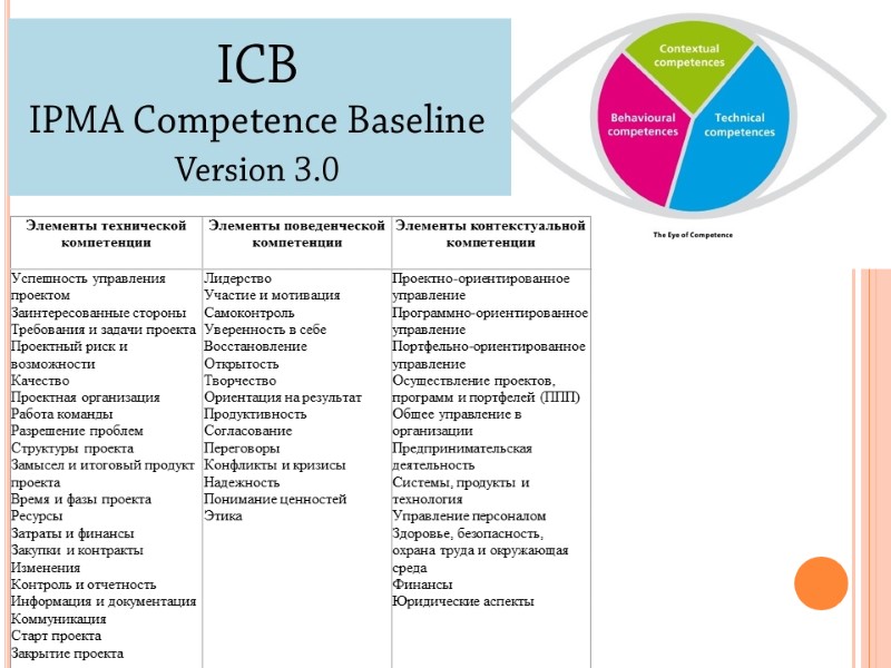 СТАНДАРТЫ ПО УПРАВЛЕНИЮ ПРОЕКТАМИ Официальный статус стандартов определяется уровнем поддержки: международный, межправительственный, региональный, например, ISO, EN и др.; государственный, национальный - BS, ANSI, DIN, ГОСТ и др.; профессиональный международный IPMA (ICB IPMA); профессиональный национальные, корпоративные APM, AIPM, P2M, PMI, СОВНЕТ и др.