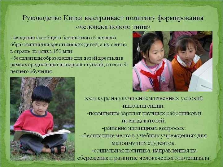Особенности рынка труда в КНР • Резкое снижение качества рабочей силы Быстрый рост численности населения привел к нехватке финансирования в человеческие ресурсы со стороны государства • Сложность в трудоустройстве выпускников Явление «educational deeping» (ED): предложение рабочих мест не успевает за спросом на них (свойственно развивающимся странам) • Отток высококвалифицированной рабочей силы Политика «рационально низкой заработной платы» : чтобы решить проблему безработицы работодатели должны были расширять штат за счет низких зарплат. Итог: утечка ценных кадров за рубеж. • Высокий уровень безработицы (см. графическое изображение на след. слайдах) • Иждивенческая нагрузка Прогнозируется так называемый «пенсионер-бум» : к 2050 г. доля неработающего населения, включая стариков и детей, составит более 50 %. Чтобы избежать этого правительство предприняло ряд мер: смягчение политики ограничения деторождаемости и повышения пенсионного возраста.