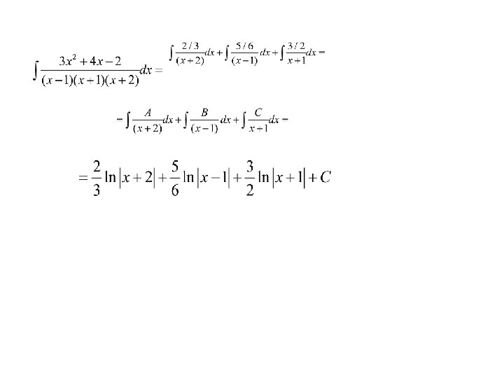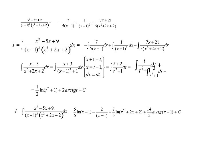 Замечание. 1) Систему для нахождения неизвестных коэффициентов можно получить из равенства Qr(x) = Pr(x) и другим способом. А именно, придавая x r конкретных значений, получим из равенства Qr(x) = Pr(x) r уравнений, связывающие неизвестные коэффициенты. Такой метод получения системы уравнений для нахождения неизвестных коэффициентов называется методом частных значений. 2) Разлагать правильную рациональную дробь в сумму простейших не следует, если есть более простой способ найти интеграл. Например, в интеграле лучше внести под знак дифференциала знаменатель. В интеграле 33 лучше предварительно сделать замену переменной