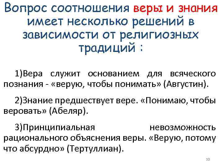 Вопрос соотношения веры и знания имеет несколько решений в зависимости от религиозных традиций : 1)Вера служит основанием для всяческого познания - «верую, чтобы понимать» (Августин). 2)Знание предшествует вере. «Понимаю, чтобы веровать» (Абеляр). 3)Принципиальная невозможность рационального объяснения веры. «Верую, потому что абсурдно» (Тертуллиан). 10