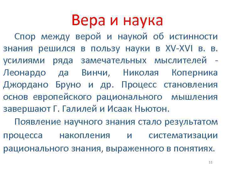 Вера и наука Спор между верой и наукой об истинности знания решился в пользу науки в XV-XVI в. усилиями ряда замечательных мыслителей - Леонардо да Винчи, Николая Коперника Джордано Бруно и др. Процесс становления основ европейского рационального мышления завершают Г. Галилей и Исаак Ньютон. Появление научного знания стало результатом процесса накопления и систематизации рационального знания, выраженного в понятиях. 11