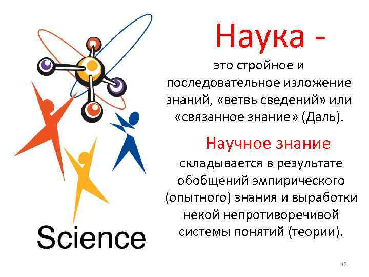 Наука - это стройное и последовательное изложение знаний, «ветвь сведений» или «связанное знание» (Даль). Научное знание складывается в результате обобщений эмпирического (опытного) знания и выработки некой непротиворечивой системы понятий (теории). 12