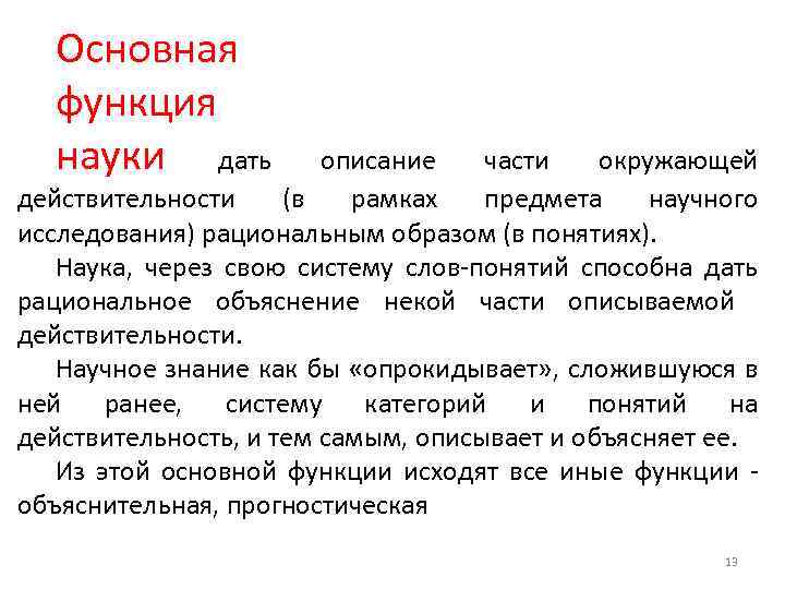 Основная функция науки дать описание части окружающей действительности (в рамках предмета научного исследования) рациональным образом (в понятиях). Наука, через свою систему слов-понятий способна дать рациональное объяснение некой части описываемой действительности. Научное знание как бы «опрокидывает» , сложившуюся в ней ранее, систему категорий и понятий на действительность, и тем самым, описывает и объясняет ее. Из этой основной функции исходят все иные функции - объяснительная, прогностическая 13