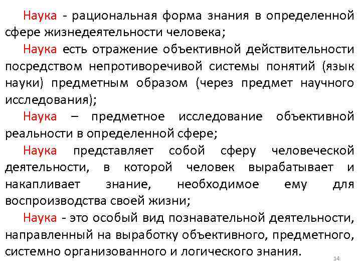 Наука - рациональная форма знания в определенной сфере жизнедеятельности человека; Наука есть отражение объективной действительности посредством непротиворечивой системы понятий (язык науки) предметным образом (через предмет научного исследования); Наука – предметное исследование объективной реальности в определенной сфере; Наука представляет собой сферу человеческой деятельности, в которой человек вырабатывает и накапливает знание, необходимое ему для воспроизводства своей жизни; Наука - это особый вид познавательной деятельности, направленный на выработку объективного, предметного, системно организованного и логического знания. 14
