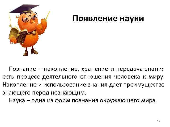 Появление науки Познание – накопление, хранение и передача знания есть процесс деятельного отношения человека к миру. Накопление и использование знания дает преимущество знающего перед незнающим. Наука – одна из форм познания окружающего мира. 15