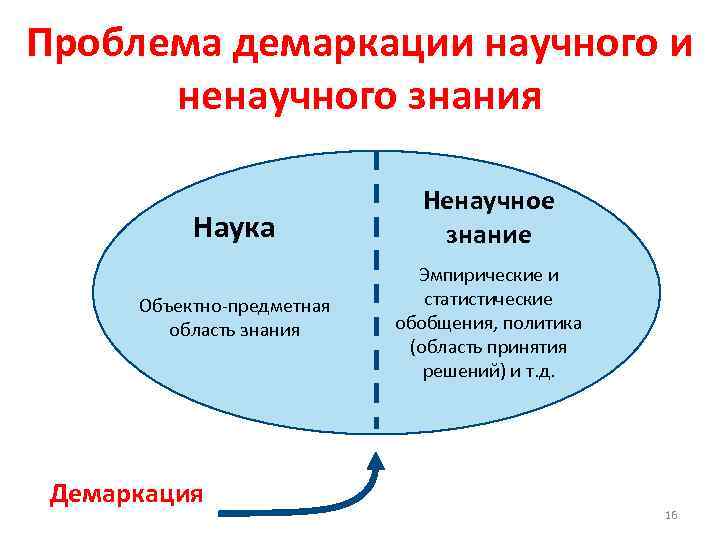 Проблема демаркации научного и ненаучного знания Наука Ненаучное знание Объектно-предметная область знания Эмпирические и статистические обобщения, политика (область принятия решений) и т. д. Демаркация 16
