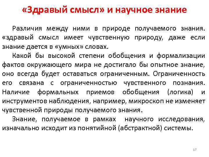 «Здравый смысл» и научное знание Различия между ними в природе получаемого знания. «здравый смысл имеет чувственную природу, даже если знание дается в «умных» словах. Какой бы высокой степени обобщения и формализации фактов окружающего мира не достигало бы опытное знание, оно всегда будет оставаться ограниченным. Ограниченность его связана с ограниченностью чувственного познания. Наличие формальных приемов обобщения (логика) и инструментов наблюдения, например, микроскоп не изменяет чувственной природы получаемого знания. Знание, получаемое в рамках научного исследования, изначально исходит из понятийной (абстрактной) системы. 17