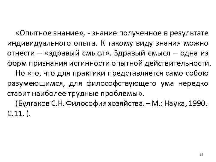 «Опытное знание» , - знание полученное в результате индивидуального опыта. К такому виду знания можно отнести – «здравый смысл» . Здравый смысл – одна из форм признания истинности опытной действительности. Но «то, что для практики представляется само собою разумеющимся, для философствующего ума нередко ставит наиболее трудные проблемы» . (Булгаков С. Н. Философия хозяйства. – М. : Наука, 1990. С. 11. ). 18