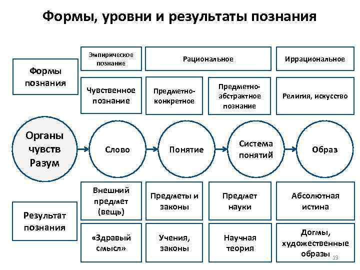 Формы, уровни и результаты познания Формы познания Органы чувств Разум Результат познания Эмпирическое познание Чувственное познание Слово Рациональное Предметноконкретное Понятие Иррациональное Предметноабстрактное познание Система понятий Религия, искусство Образ Внешний предмет (вещь) Предметы и законы Предмет науки Абсолютная истина «Здравый смысл» Учения, законы Научная теория Догмы, художественные образы 19