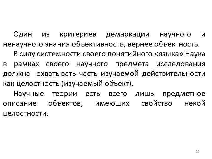 Один из критериев демаркации научного и ненаучного знания объективность, вернее объектность. В силу системности своего понятийного «языка» Наука в рамках своего научного предмета исследования должна охватывать часть изучаемой действительности как целостность (изучаемый объект). Научные теории есть всего лишь предметное описание объектов, имеющих свойство некой целостности. 20