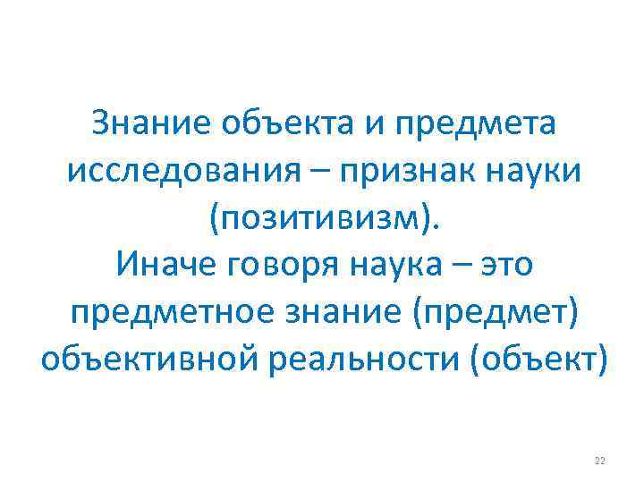 Знание объекта и предмета исследования – признак науки (позитивизм). Иначе говоря наука – это предметное знание (предмет) объективной реальности (объект) 22