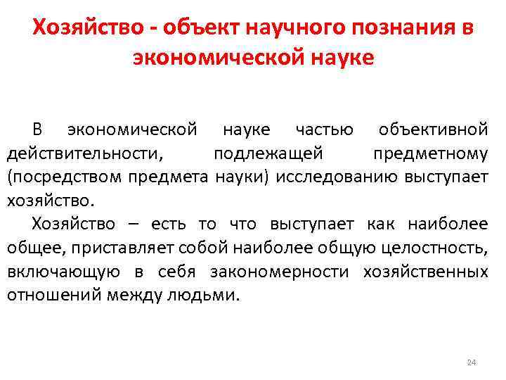 Хозяйство - объект научного познания в экономической науке В экономической науке частью объективной действительности, подлежащей предметному (посредством предмета науки) исследованию выступает хозяйство. Хозяйство – есть то что выступает как наиболее общее, приставляет собой наиболее общую целостность, включающую в себя закономерности хозяйственных отношений между людьми. 24
