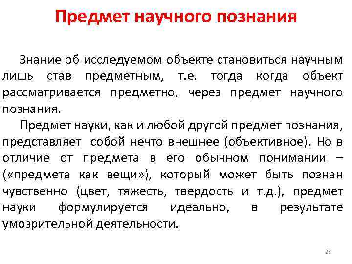 Предмет научного познания Знание об исследуемом объекте становиться научным лишь став предметным, т. е. тогда когда объект рассматривается предметно, через предмет научного познания. Предмет науки, как и любой другой предмет познания, представляет собой нечто внешнее (объективное). Но в отличие от предмета в его обычном понимании – ( «предмета как вещи» ), который может быть познан чувственно (цвет, тяжесть, твердость и т. д. ), предмет науки формулируется идеально, в результате умозрительной деятельности. 25