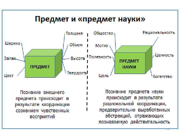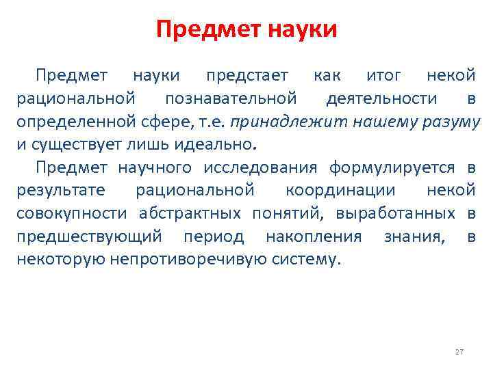 Предмет науки предстает как итог некой рациональной познавательной деятельности в определенной сфере, т. е. принадлежит нашему разуму и существует лишь идеально. Предмет научного исследования формулируется в результате рациональной координации некой совокупности абстрактных понятий, выработанных в предшествующий период накопления знания, в некоторую непротиворечивую систему. 27
