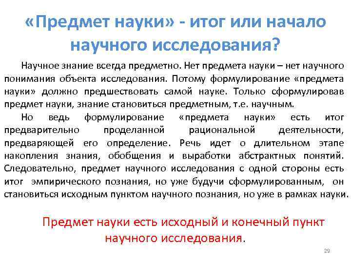 «Предмет науки» - итог или начало научного исследования? Научное знание всегда предметно. Нет предмета науки – нет научного понимания объекта исследования. Потому формулирование «предмета науки» должно предшествовать самой науке. Только сформулировав предмет науки, знание становиться предметным, т. е. научным. Но ведь формулирование «предмета науки» есть итог предварительно проделанной рациональной деятельности, предваряющей его определение. Речь идет о длительном этапе накопления знания, обобщения и выработки абстрактных понятий. Следовательно, предмет научного исследования с одной стороны есть итог эмпирического познания, но уже будучи сформулированным, он становиться исходным пунктом научного познания, но уже в рамках науки. Предмет науки есть исходный и конечный пункт научного исследования. 29
