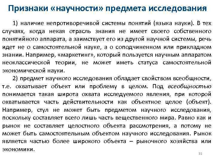 Признаки «научности» предмета исследования 1) наличие непротиворечивой системы понятий (языка науки). В тех случаях, когда некая отрасль знания не имеет своего собственного понятийного аппарата, а заимствует его из другой научной системы, речь идет не о самостоятельной науке, а о соподчиненном или прикладном знании. Например, «маркетинг» , который пользуется научным аппаратом неоклассической теории, не может иметь статуса самостоятельной экономической науки. 2) предмет научного исследования обладает свойством всеобщности, т. е. охватывает объект или проблему в целом. Под всеобщностью понимается такая широта охвата исследуемого явления, при которой охватывается часть действительности как объектное целое (объект). Например, стул не может быть предметом научного исследования, поскольку составляет всего лишь часть вещественного мира. Равно как и рынок не составляет целостного объекта рассмотрения, а потому не может быть самостоятельным объектом научного исследования. Рынок является частью более широкого объекта – рыночного хозяйства или экономики. 31