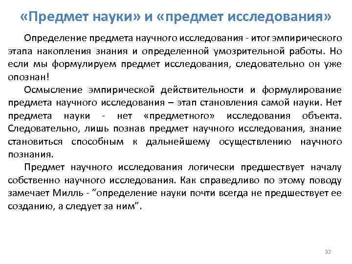 «Предмет науки» и «предмет исследования» Определение предмета научного исследования - итог эмпирического этапа накопления знания и определенной умозрительной работы. Но если мы формулируем предмет исследования, следовательно он уже опознан! Осмысление эмпирической действительности и формулирование предмета научного исследования – этап становления самой науки. Нет предмета науки - нет «предметного» исследования объекта. Следовательно, лишь познав предмет научного исследования, знание становиться способным к дальнейшему осуществлению научного познания. Предмет научного исследования логически предшествует началу собственно научного исследования. Как справедливо по этому поводу замечает Милль - “определение науки почти всегда не предшествует ее созданию, а следует за ним”. 32